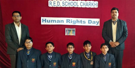 ‘Human Rights Day’ was celebrated in R.E.D. School Charkhi. The stage was conducted by Garvit. Good thought was presented by Lakshay. Ankush and Aman presented the articles. Praveer presented G.K. quiz. The main objective of this programme was to aware the students about the Human Rights under our constitution. This programme was executed under the supervision of Activity Incharge Mr. Mukesh Tanwar and Mr. Pawan Baloda. Mr. Baloda, Social Science teacher explained all human rights in details to all the students.