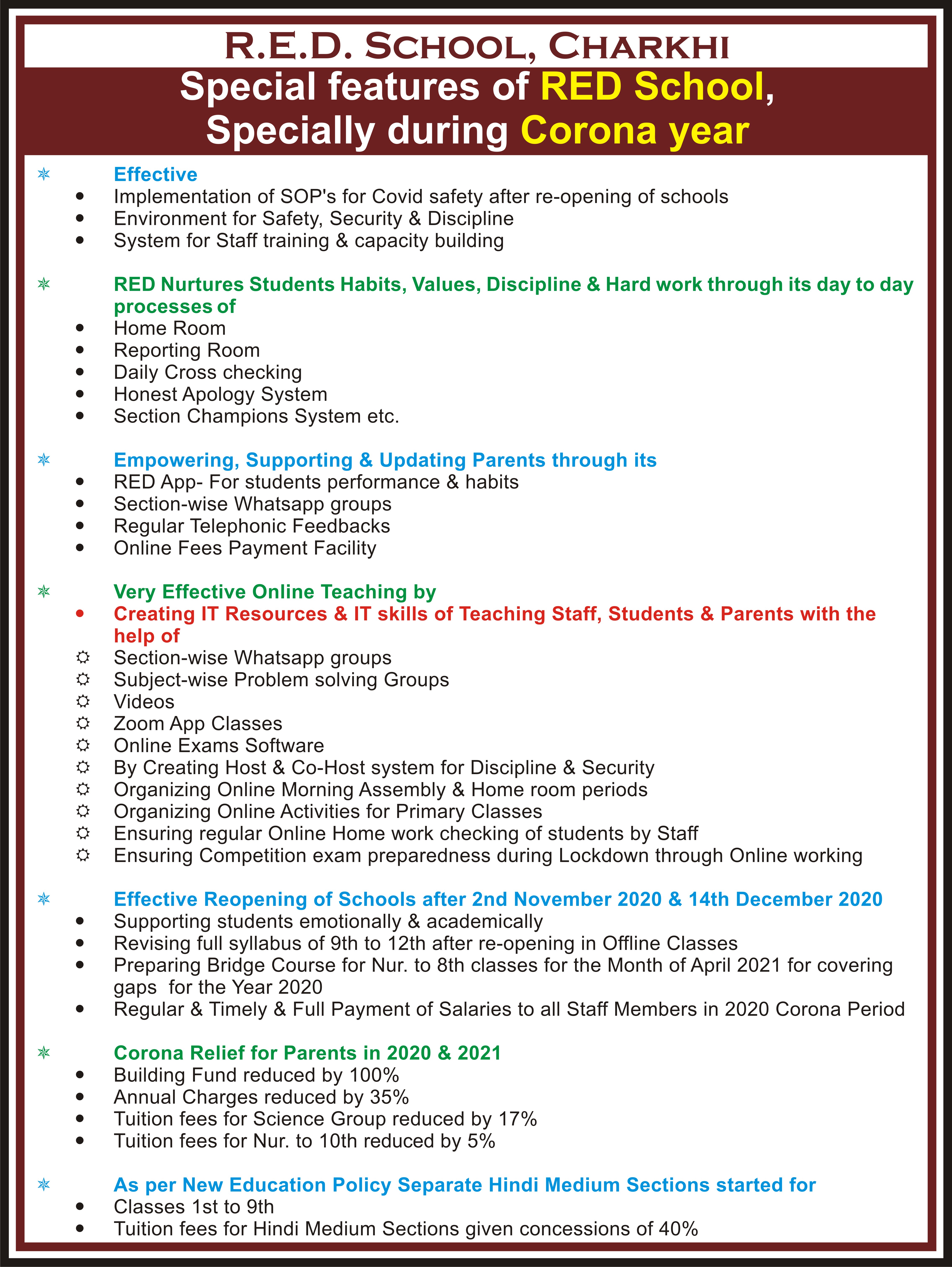 Special Features of RED School, Specially during Corona year